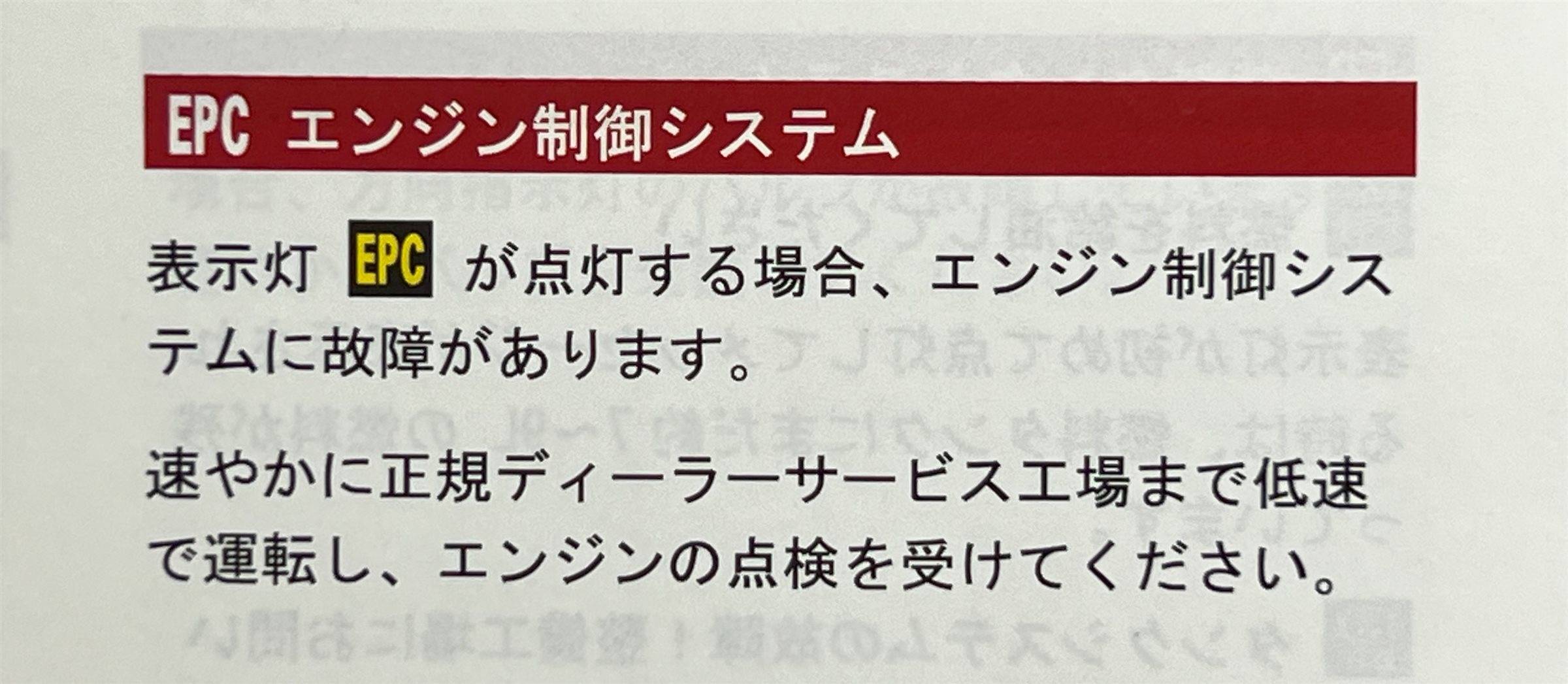 EPC警告灯が点灯する原因はいくつかあるかと思いますが、私の経験をふまえ紹介したいと思います。
